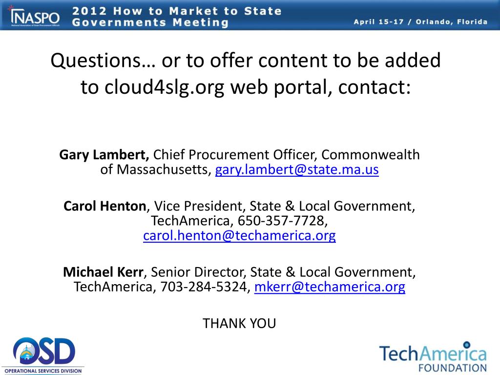 Questions… or to offer content to be added to cloud4slg.org web portal, contact: Gary Lambert, Chief Procurement Officer, Commonwealth of Massachusetts, gary.lambert@state.ma.us Carol Henton, Vice President, State & Local Government, TechAmerica, 650-357-7728, carol.henton@techamerica.org Michael Kerr, Senior Director, State & Local Government, TechAmerica, 703-284-5324, mkerr@techamerica.org THANK YOU