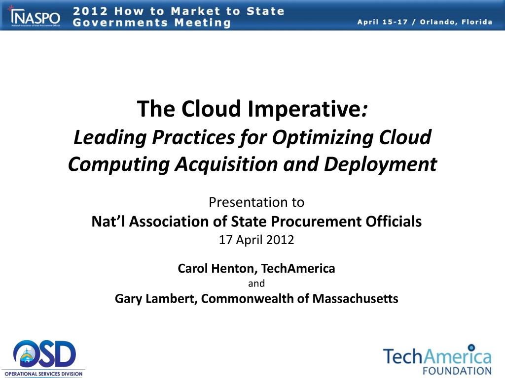 The Cloud Imperative: Leading Practices for Optimizing Cloud Computing Acquisition and Deployment Presentation to Nat’l Association of State Procurement Officials 17 April 2012 Carol Henton, TechAmerica and Gary Lambert, Commonwealth of Massachusetts