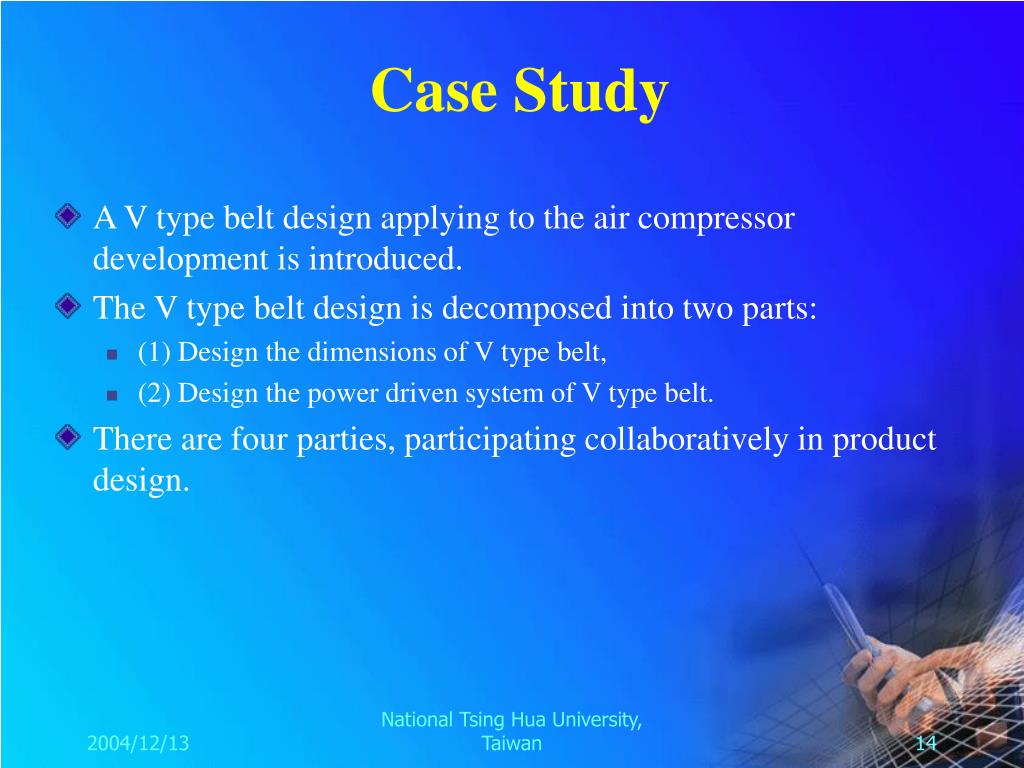 Case Study • A V type belt design applying to the air compressor development is introduced. • The V type belt design is decomposed into two parts: • (1) Design the dimensions of V type belt, • (2) Design the power driven system of V type belt. • There are four parties, participating collaboratively in product design. National Tsing Hua University, Taiwan