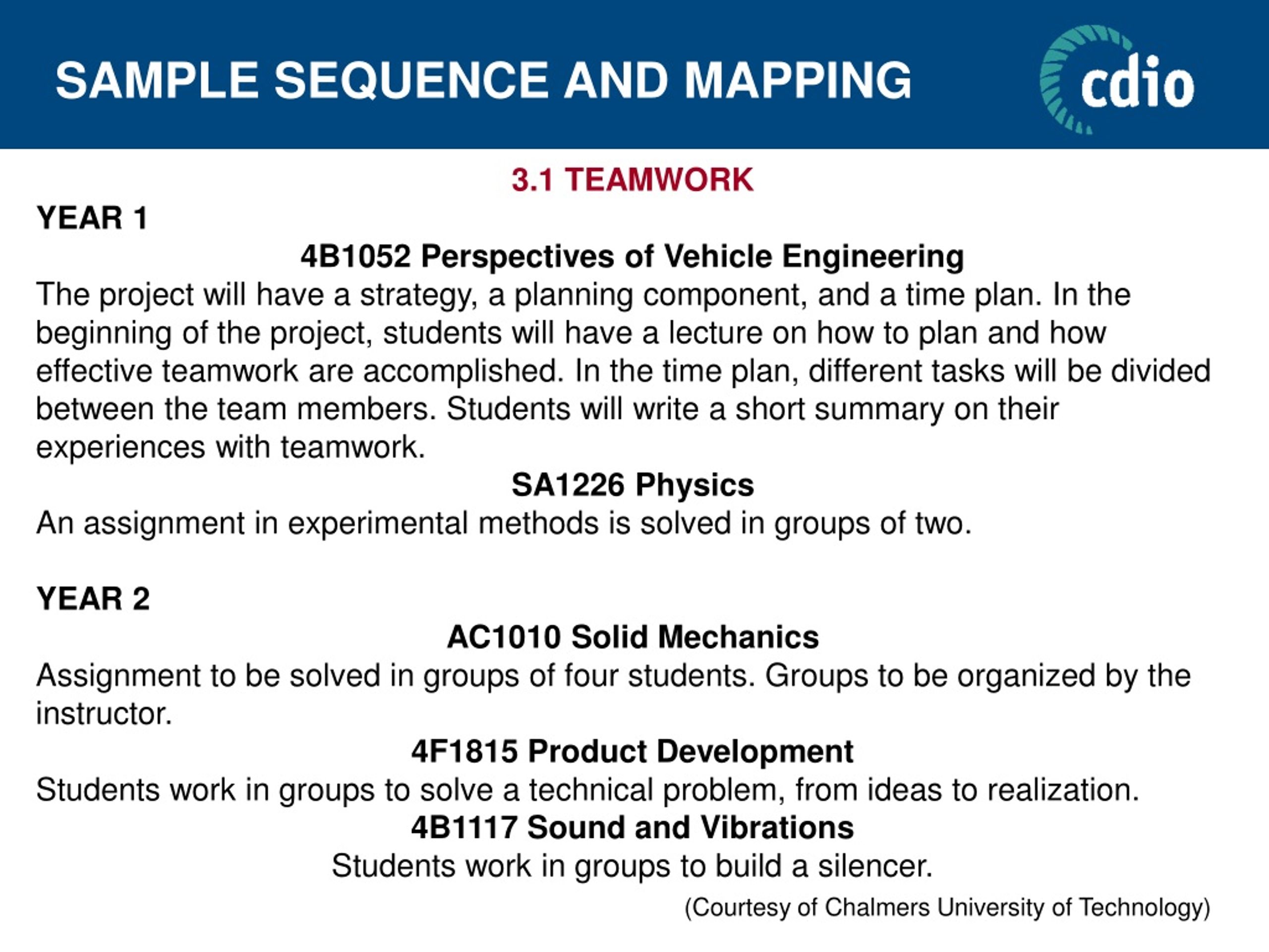 SAMPLE SEQUENCE AND MAPPING • 3.1 TEAMWORK • YEAR 1 • 4B1052 Perspectives of Vehicle Engineering • The project will have a strategy, a planning component, and a time plan. In the beginning of the project, students will have a lecture on how to plan and how effective teamwork are accomplished. In the time plan, different tasks will be divided between the team members. Students will write a short summary on their experiences with teamwork. • SA1226 Physics • An assignment in experimental methods is solved in groups of two. • YEAR 2 • AC1010 Solid Mechanics • Assignment to be solved in groups of four students. Groups to be organized by the instructor. • 4F1815 Product Development • Students work in groups to solve a technical problem, from ideas to realization. • 4B1117 Sound and Vibrations • Students work in groups to build a silencer. (Courtesy of Chalmers University of Technology)
