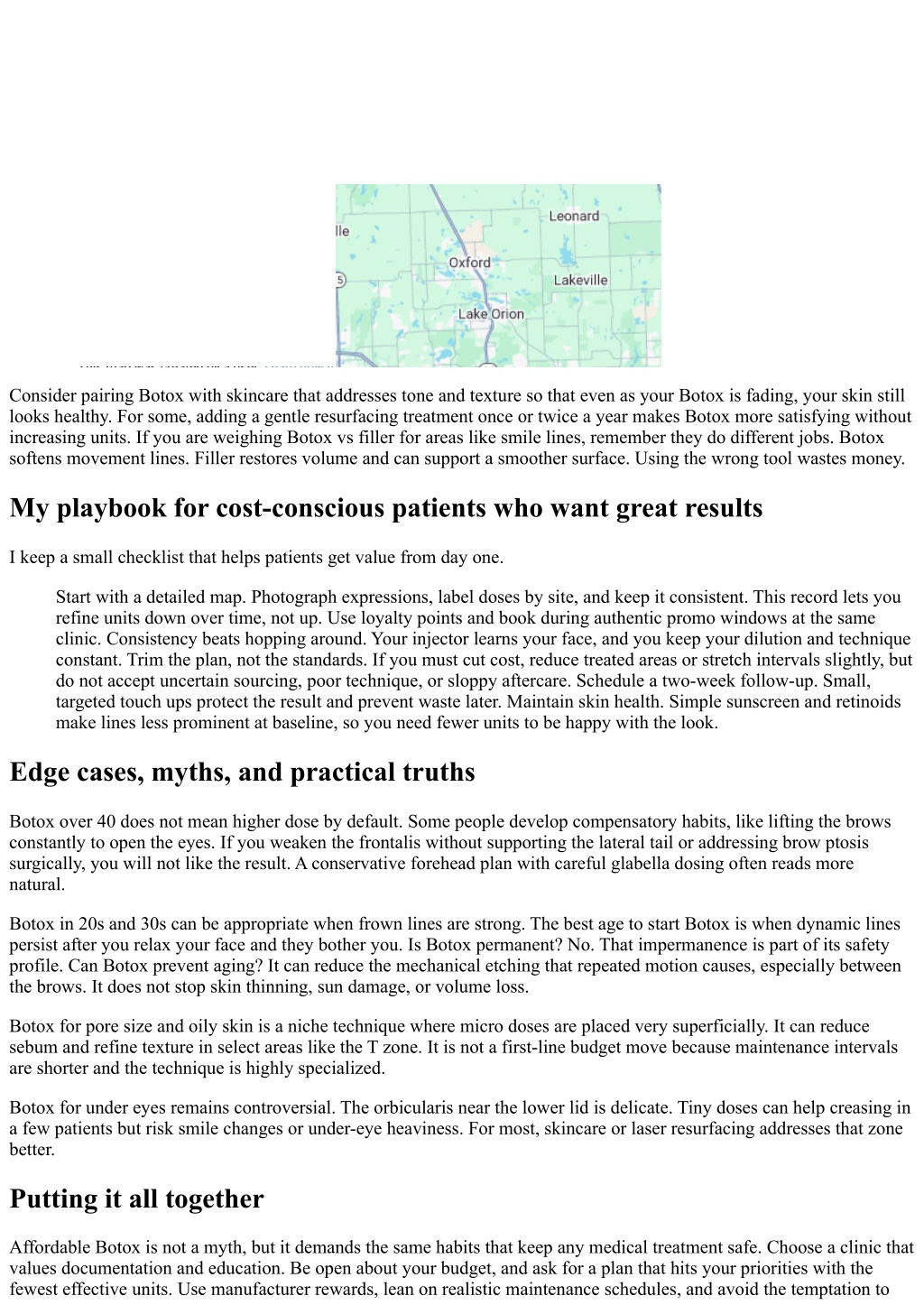 This map was created by a user Learn how to create your own Consider pairing Botox with skincare that addresses tone and texture so that even as your Botox is fading, your skin still looks healthy. For some, adding a gentle resurfacing treatment once or twice a year makes Botox more satisfying without increasing units. If you are weighing Botox vs filler for areas like smile lines, remember they do different jobs. Botox softens movement lines. Filler restores volume and can support a smoother surface. Using the wrong tool wastes money. My playbook for cost-conscious patients who want great results I keep a small checklist that helps patients get value from day one. Start with a detailed map. Photograph expressions, label doses by site, and keep it consistent. This record lets you refine units down over time, not up. Use loyalty points and book during authentic promo windows at the same clinic. Consistency beats hopping around. Your injector learns your face, and you keep your dilution and technique constant. Trim the plan, not the standards. If you must cut cost, reduce treated areas or stretch intervals slightly, but do not accept uncertain sourcing, poor technique, or sloppy aftercare. Schedule a two-week follow-up. Small, targeted touch ups protect the result and prevent waste later. Maintain skin health. Simple sunscreen and retinoids make lines less prominent at baseline, so you need fewer units to be happy with the look. Edge cases, myths, and practical truths Botox over 40 does not mean higher dose by default. Some people develop compensatory habits, like lifting the brows constantly to open the eyes. If you weaken the frontalis without supporting the lateral tail or addressing brow ptosis surgically, you will not like the result. A conservative forehead plan with careful glabella dosing often reads more natural. Botox in 20s and 30s can be appropriate when frown lines are strong. The best age to start Botox is when dynamic lines persist after you relax your face and they bother you. Is Botox permanent? No. That impermanence is part of its safety profile. Can Botox prevent aging? It can reduce the mechanical etching that repeated motion causes, especially between the brows. It does not stop skin thinning, sun damage, or volume loss. Botox for pore size and oily skin is a niche technique where micro doses are placed very superficially. It can reduce sebum and refine texture in select areas like the T zone. It is not a first-line budget move because maintenance intervals are shorter and the technique is highly specialized. Botox for under eyes remains controversial. The orbicularis near the lower lid is delicate. Tiny doses can help creasing in a few patients but risk smile changes or under-eye heaviness. For most, skincare or laser resurfacing addresses that zone better. Putting it all together Affordable Botox is not a myth, but it demands the same habits that keep any medical treatment safe. Choose a clinic that values documentation and education. Be open about your budget, and ask for a plan that hits your priorities with the fewest effective units. Use manufacturer rewards, lean on realistic maintenance schedules, and avoid the temptation to