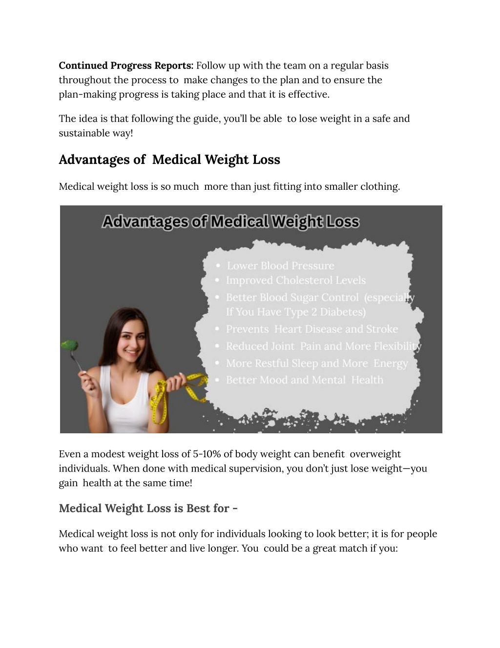 Continued Progress Reports: Follow up with the team on a regular basis throughout the process to make changes to the plan and to ensure the plan-making progress is taking place and that it is effective. The idea is that following the guide, you’ll be able to lose weight in a safe and sustainable way! Advantages of Medical Weight Loss Medical weight loss is so much more than just fitting into smaller clothing. Even a modest weight loss of 5-10% of body weight can benefit overweight individuals. When done with medical supervision, you don’t just lose weight—you gain health at the same time! Medical Weight Loss is Best for - Medical weight loss is not only for individuals looking to look better; it is for people who want to feel better and live longer. You could be a great match if you: