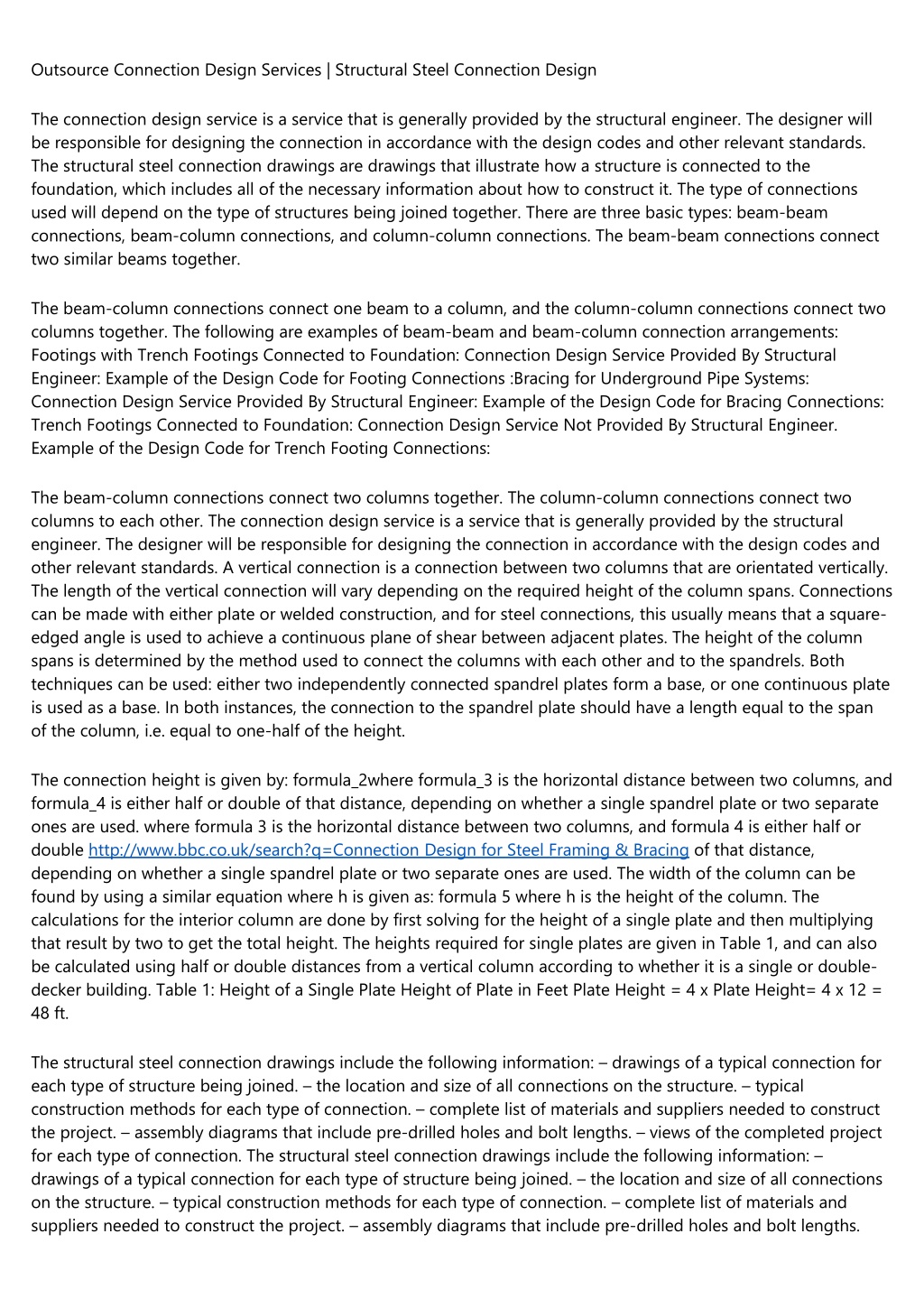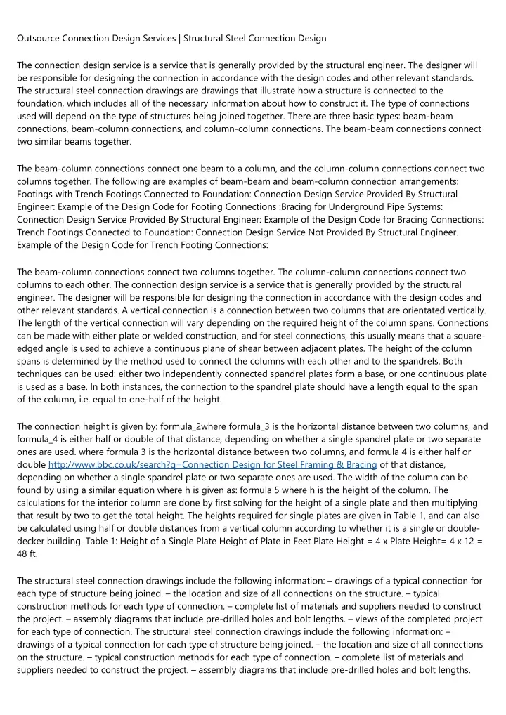 Outsource Connection Design Services | Structural Steel Connection Design The connection design service is a service that is generally provided by the structural engineer. The designer will be responsible for designing the connection in accordance with the design codes and other relevant standards. The structural steel connection drawings are drawings that illustrate how a structure is connected to the foundation, which includes all of the necessary information about how to construct it. The type of connections used will depend on the type of structures being joined together. There are three basic types: beam-beam connections, beam-column connections, and column-column connections. The beam-beam connections connect two similar beams together. The beam-column connections connect one beam to a column, and the column-column connections connect two columns together. The following are examples of beam-beam and beam-column connection arrangements: Footings with Trench Footings Connected to Foundation: Connection Design Service Provided By Structural Engineer: Example of the Design Code for Footing Connections :Bracing for Underground Pipe Systems: Connection Design Service Provided By Structural Engineer: Example of the Design Code for Bracing Connections: Trench Footings Connected to Foundation: Connection Design Service Not Provided By Structural Engineer. Example of the Design Code for Trench Footing Connections: The beam-column connections connect two columns together. The column-column connections connect two columns to each other. The connection design service is a service that is generally provided by the structural engineer. The designer will be responsible for designing the connection in accordance with the design codes and other relevant standards. A vertical connection is a connection between two columns that are orientated vertically. The length of the vertical connection will vary depending on the required height of the column spans. Connections can be made with either plate or welded construction, and for steel connections, this usually means that a square- edged angle is used to achieve a continuous plane of shear between adjacent plates. The height of the column spans is determined by the method used to connect the columns with each other and to the spandrels. Both techniques can be used: either two independently connected spandrel plates form a base, or one continuous plate is used as a base. In both instances, the connection to the spandrel plate should have a length equal to the span of the column, i.e. equal to one-half of the height. The connection height is given by: formula_2where formula_3 is the horizontal distance between two columns, and formula_4 is either half or double of that distance, depending on whether a single spandrel plate or two separate ones are used. where formula 3 is the horizontal distance between two columns, and formula 4 is either half or double http://www.bbc.co.uk/search?q=Connection Design for Steel Framing & Bracing of that distance, depending on whether a single spandrel plate or two separate ones are used. The width of the column can be found by using a similar equation where h is given as: formula 5 where h is the height of the column. The calculations for the interior column are done by first solving for the height of a single plate and then multiplying that result by two to get the total height. The heights required for single plates are given in Table 1, and can also be calculated using half or double distances from a vertical column according to whether it is a single or double- decker building. Table 1: Height of a Single Plate Height of Plate in Feet Plate Height = 4 x Plate Height= 4 x 12 = 48 ft. The structural steel connection drawings include the following information: – drawings of a typical connection for each type of structure being joined. – the location and size of all connections on the structure. – typical construction methods for each type of connection. – complete list of materials and suppliers needed to construct the project. – assembly diagrams that include pre-drilled holes and bolt lengths. – views of the completed project for each type of connection. The structural steel connection drawings include the following information: – drawings of a typical connection for each type of structure being joined. – the location and size of all connections on the structure. – typical construction methods for each type of connection. – complete list of materials and suppliers needed to construct the project. – assembly diagrams that include pre-drilled holes and bolt lengths.