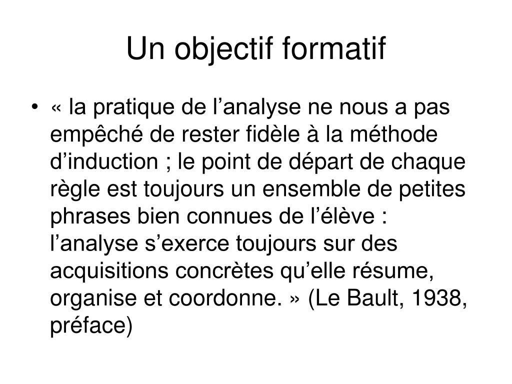 Un objectif formatif • « la pratique de l’analyse ne nous a pas empêché de rester fidèle à la méthode d’induction ; le point de départ de chaque règle est toujours un ensemble de petites phrases bien connues de l’élève : l’analyse s’exerce toujours sur des acquisitions concrètes qu’elle résume, organise et coordonne. » (Le Bault, 1938, préface)