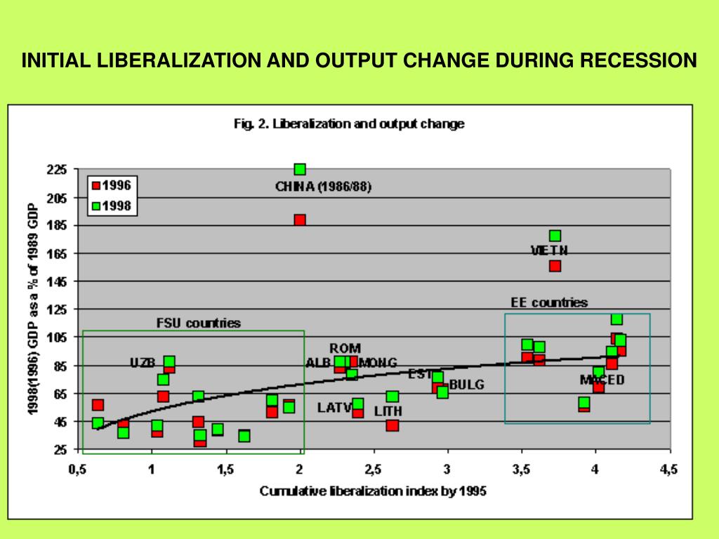 Conclusions • At the recovery stage liberalization starts to affect growth positively, whereas the impact of pre-transition distortions disappears. Institutional capacity and macroeconomic policy continue to be important prerequisites for successful performance. • Liberalization at the recovery stage influences performance positively because it creates market stimuli without causing rapid collapse of output of inefficient industries, which cannot be compensated fully by the rise of efficient industries due to investment constraints.