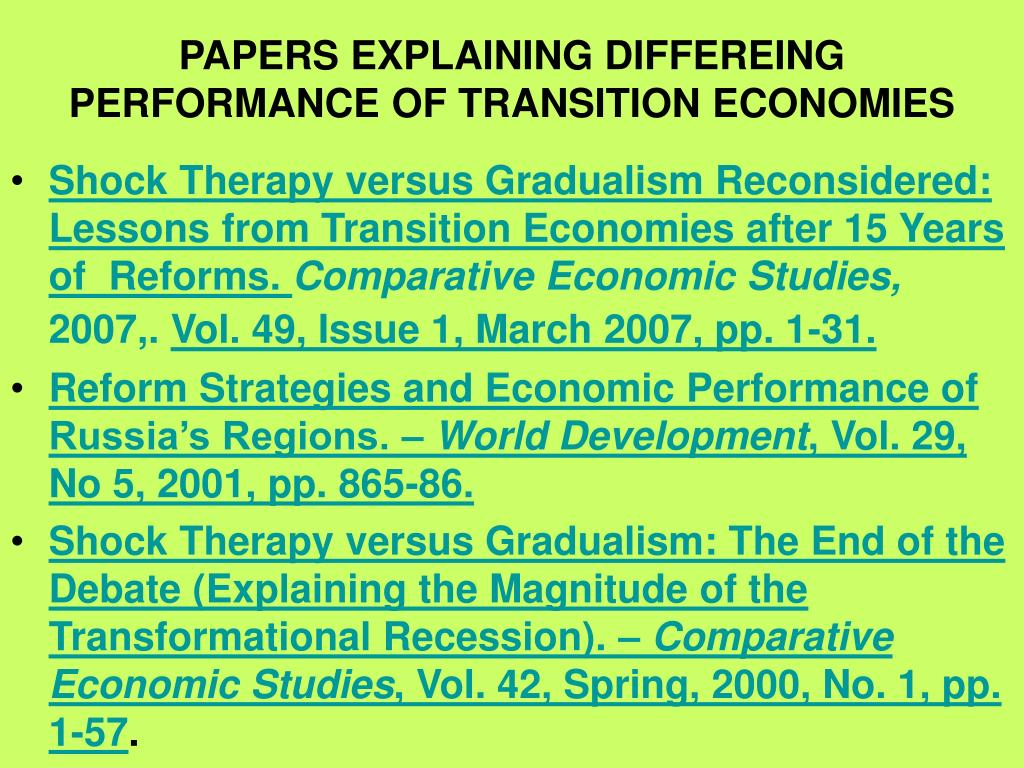 PAPERS EXPLAINING DIFFEREING PERFORMANCE OF TRANSITION ECONOMIES • Shock Therapy versus Gradualism Reconsidered: Lessons from Transition Economies after 15 Years of Reforms. Comparative Economic Studies, 2007,. Vol. 49, Issue 1, March 2007, pp. 1-31. • Reform Strategies and Economic Performance of Russia’s Regions. – World Development, Vol. 29, No 5, 2001, pp. 865-86. • Shock Therapy versus Gradualism: The End of the Debate (Explaining the Magnitude of the Transformational Recession). – Comparative Economic Studies, Vol. 42, Spring, 2000, No. 1, pp. 1-57.