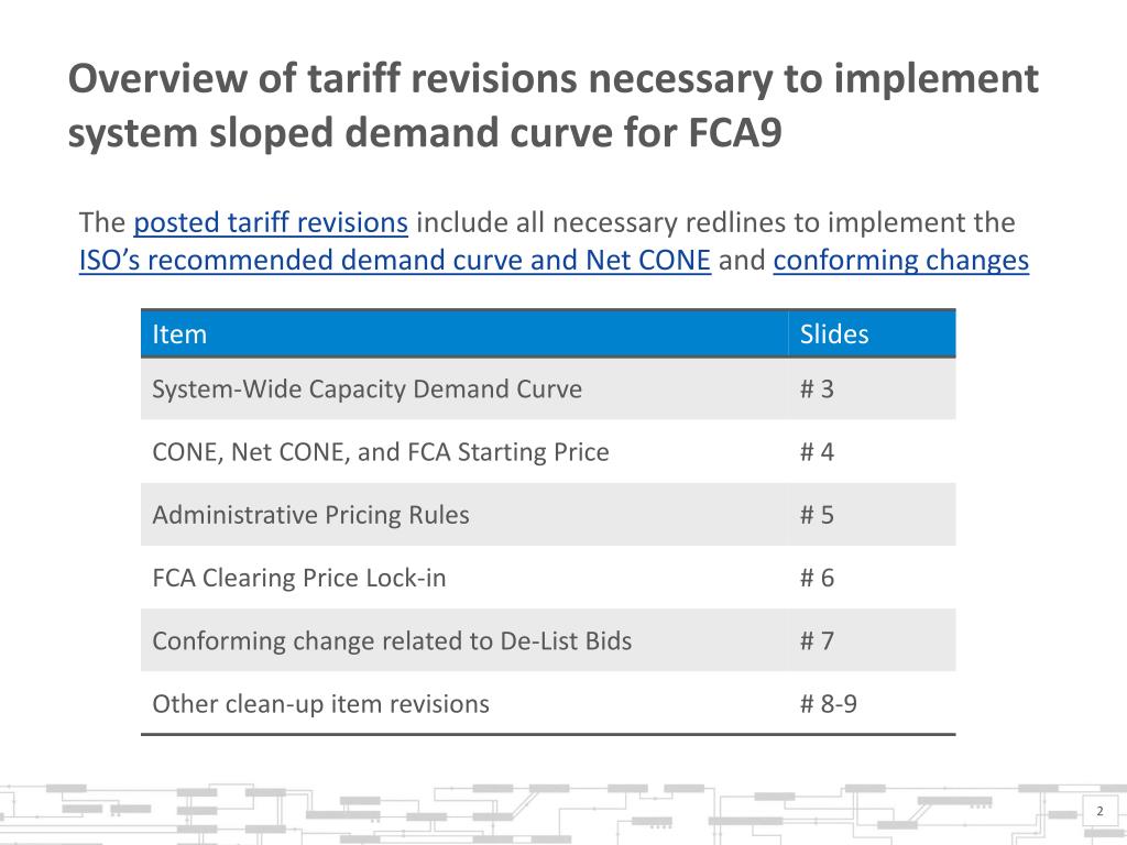 Overview of tariff revisions necessary to implement system sloped demand curve for FCA9 The posted tariff revisions include all necessary redlines to implement the ISO’s recommended demand curve and Net CONE and conforming changes