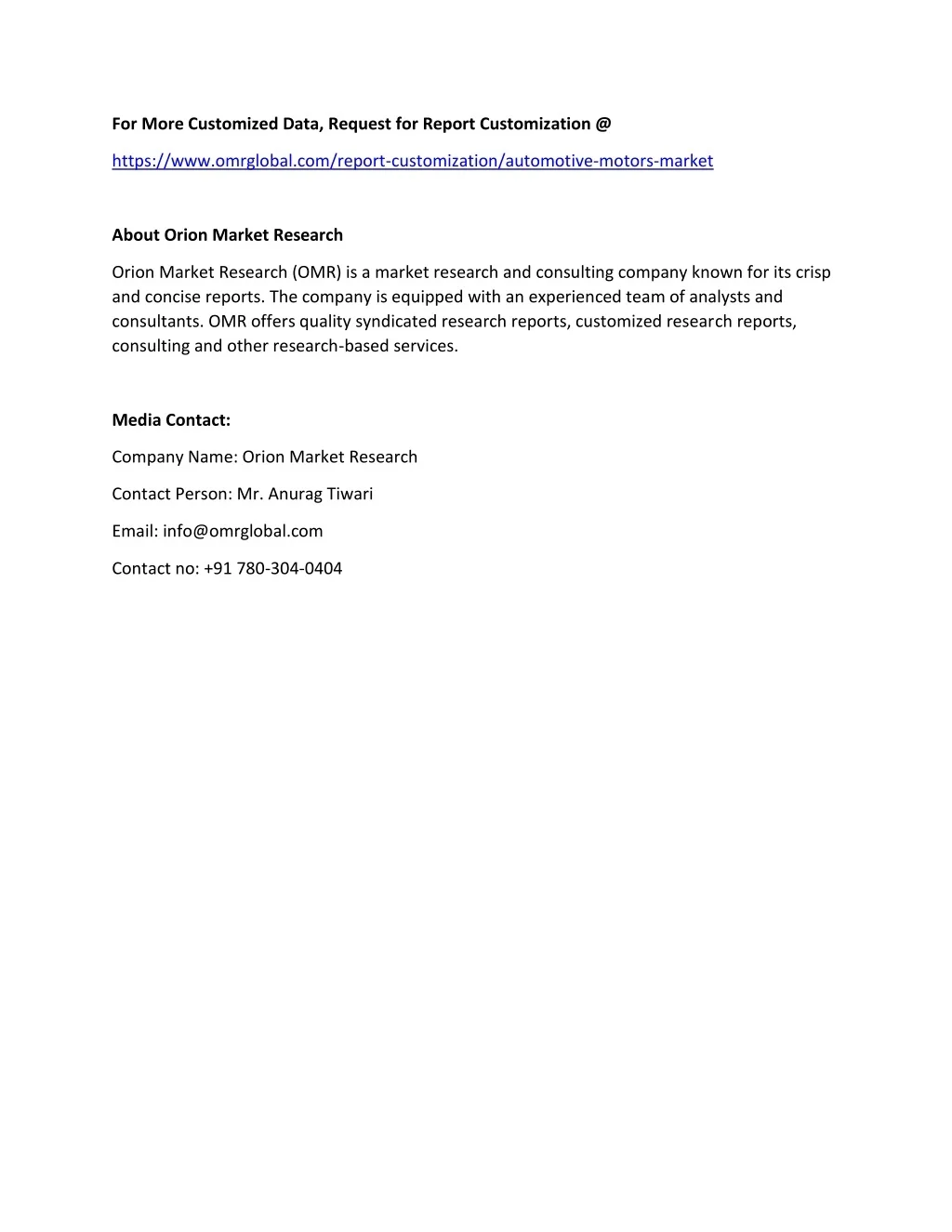 For More Customized Data, Request for Report Customization @ https://www.omrglobal.com/report-customization/automotive-motors-market About Orion Market Research Orion Market Research (OMR) is a market research and consulting company known for its crisp and concise reports. The company is equipped with an experienced team of analysts and consultants. OMR offers quality syndicated research reports, customized research reports, consulting and other research-based services. Media Contact: Company Name: Orion Market Research Contact Person: Mr. Anurag Tiwari Email: info@omrglobal.com Contact no: +91 780-304-0404