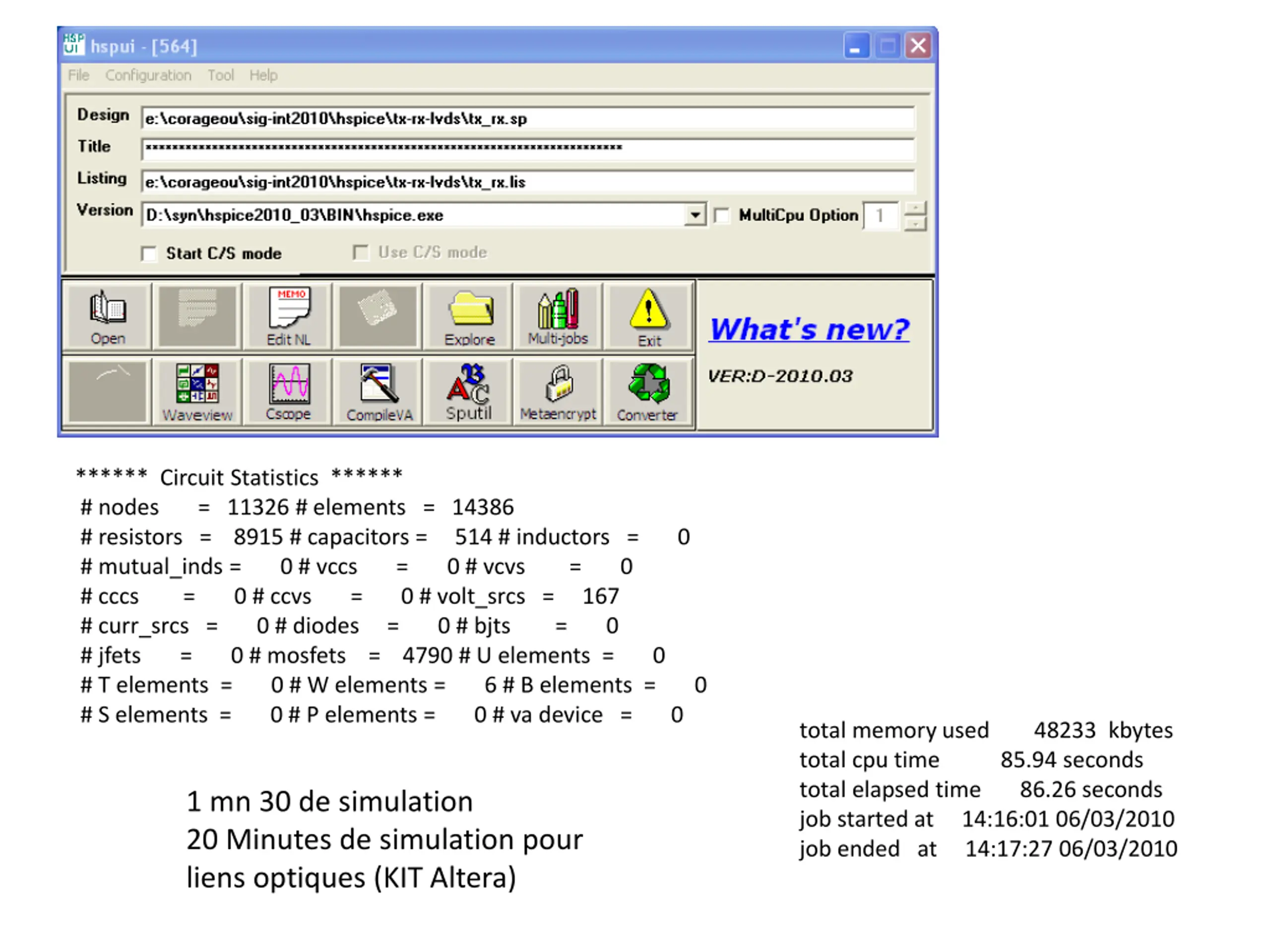 7. ****** Circuit Statistics ****** # nodes = 11326 # elements = 14386 # resistors = 8915 # capacitors = 514 # inductors = 0 # mutual_inds = 0 # vccs # cccs = 0 # ccvs = 0 # volt_srcs = 167 # curr_srcs = 0 # diodes = 0 # bjts # jfets = 0 # mosfets = 4790 # U elements = 0 # T elements = 0 # W elements = 6 # B elements = 0 # S elements = 0 # P elements = 0 # va device = 0 = 0 # vcvs = 0 = 0 total memory used 48233 kbytes total cpu time 85.94 seconds total elapsed time 86.26 seconds job started at 14:16:01 06/03/2010 job ended at 14:17:27 06/03/2010 1 mn 30 de simulation 20 Minutes de simulation pour liens optiques (KIT Altera)