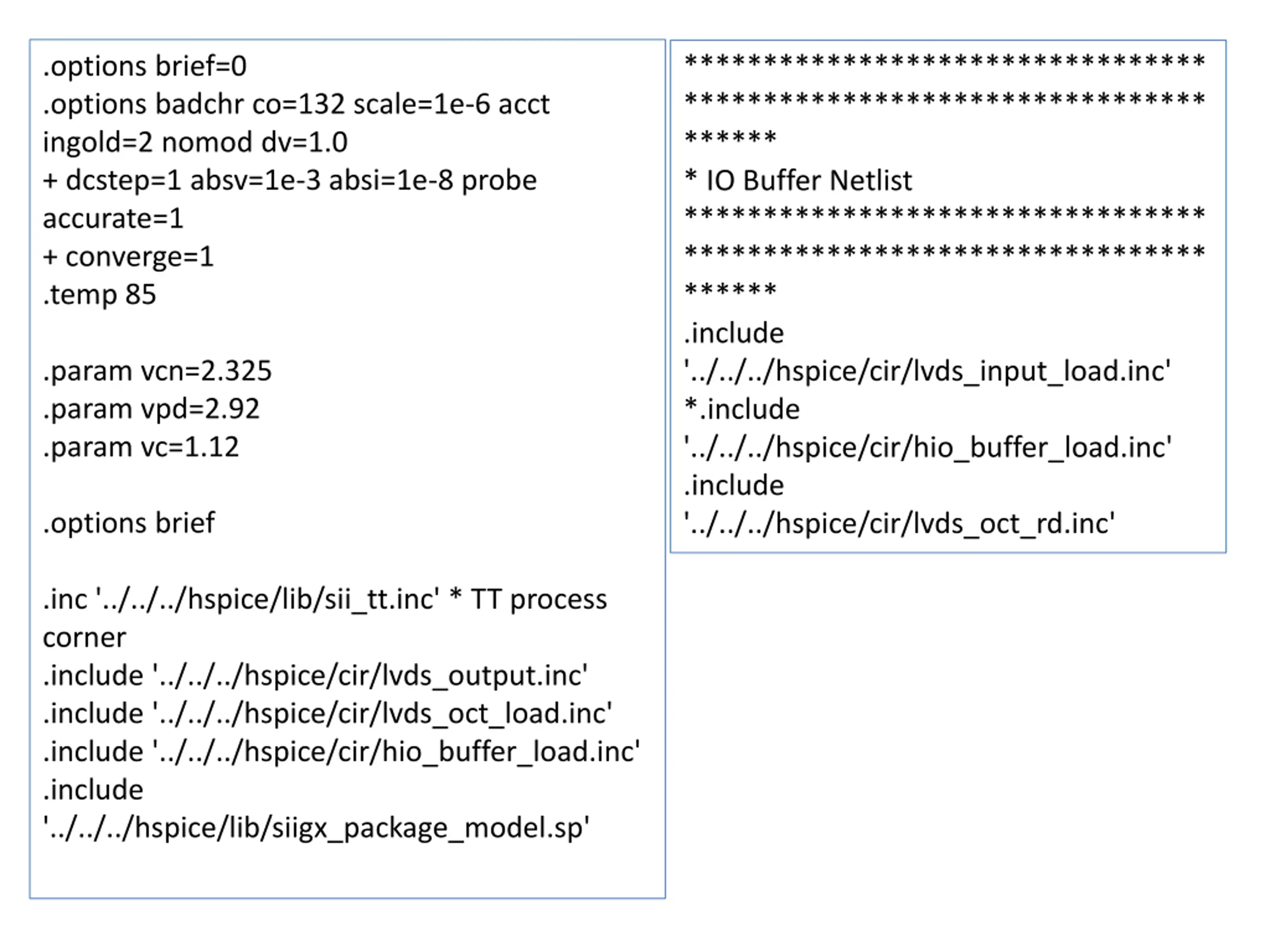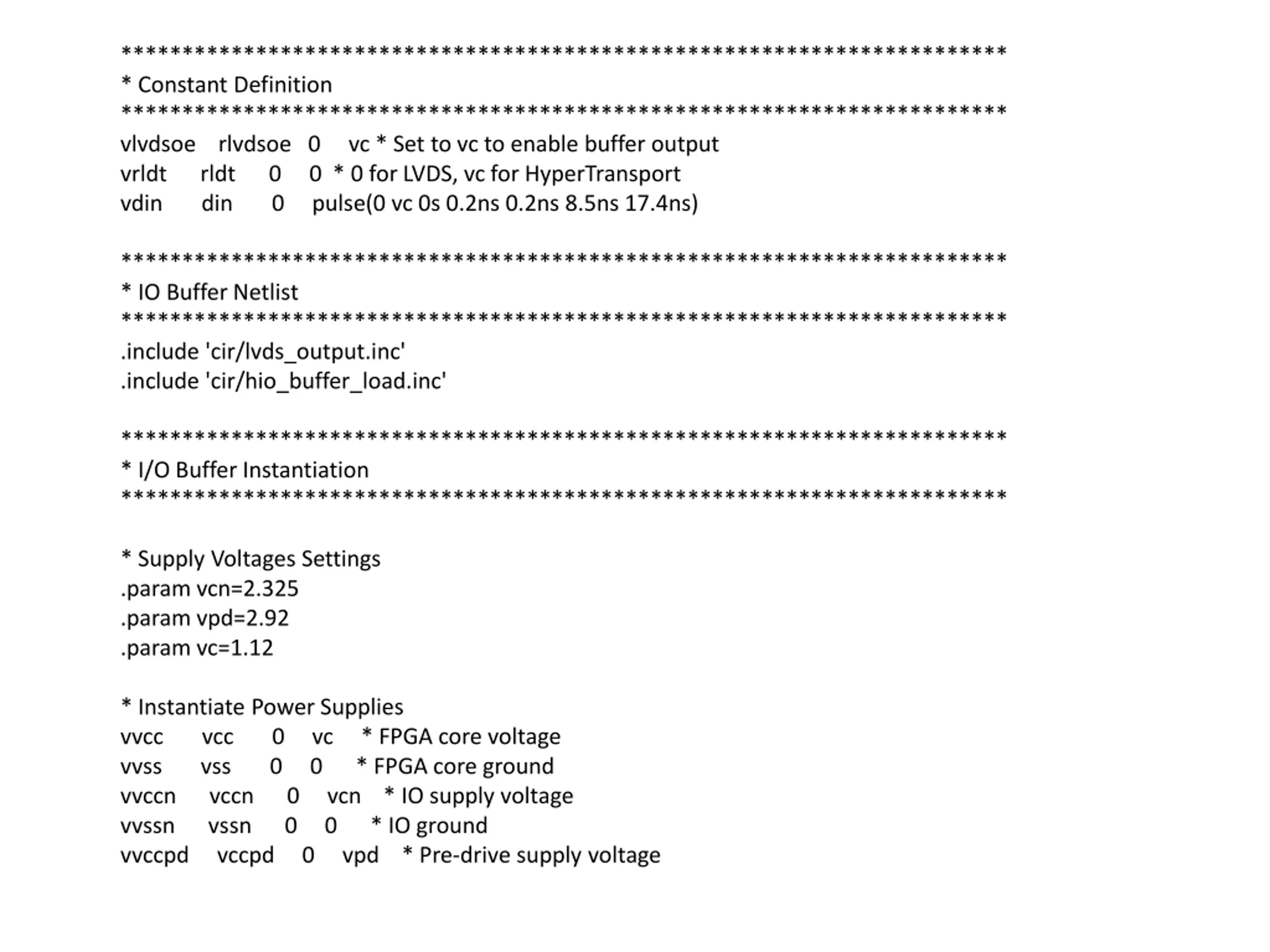 15. ************************************************************************************************************************************************ * Quartus HSPICE Writer I/O Simulation Deck * * This spice simulation deck was automatically generated by Quartus for * the followingIO settings: * * Device: EP2SGX90FF1508C3 * Speed Grade: C3 * Pins: AD33 (dataout1) * AE33 (dataout1(n)) * Bank: IO Bank 1 (Row I/O) * I/O Standard: LVDS * OCT: Off ************************************************************************ * Process Settings ************************************************************************ .options brief .inc 'lib/sii_tt.inc' * TT process corner ************************************************************************ * Simulation Options ************************************************************************ .options brief=0 .options badchr co=132 scale=1e-6 acct ingold=2 nomod dv=1.0 + dcstep=1 absv=1e-3 absi=1e-8 probe csdf=2 accurate=1 + converge=1 .temp 85