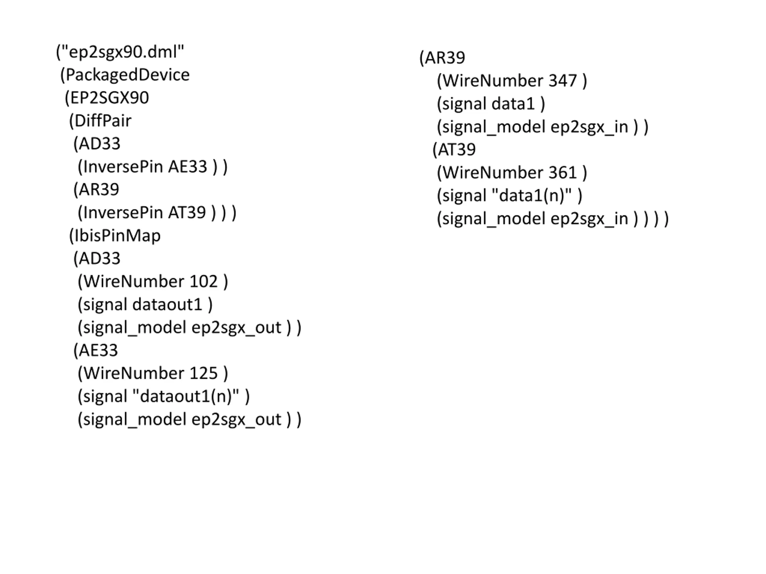 19. ("ep2sgx90.dml" (PackagedDevice (EP2SGX90 (DiffPair (AD33 (InversePin AE33 ) ) (AR39 (InversePin AT39 ) ) ) (IbisPinMap (AD33 (WireNumber 102 ) (signal dataout1 ) (signal_model ep2sgx_out ) ) (AE33 (WireNumber 125 ) (signal "dataout1(n)" ) (signal_model ep2sgx_out ) ) (AR39 (WireNumber 347 ) (signal data1 ) (signal_model ep2sgx_in ) ) (AT39 (WireNumber 361 ) (signal "data1(n)" ) (signal_model ep2sgx_in ) ) ) )