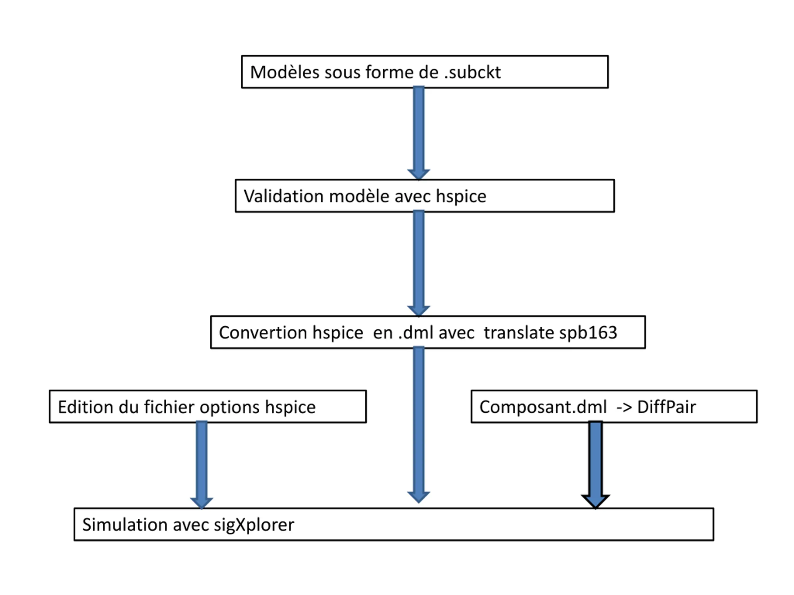 12. Modèles sous forme de .subckt Validation modèle avec hspice Convertion hspice en .dml avec translate spb163 Composant.dml -> DiffPair Edition du fichier options hspice Simulation avec sigXplorer