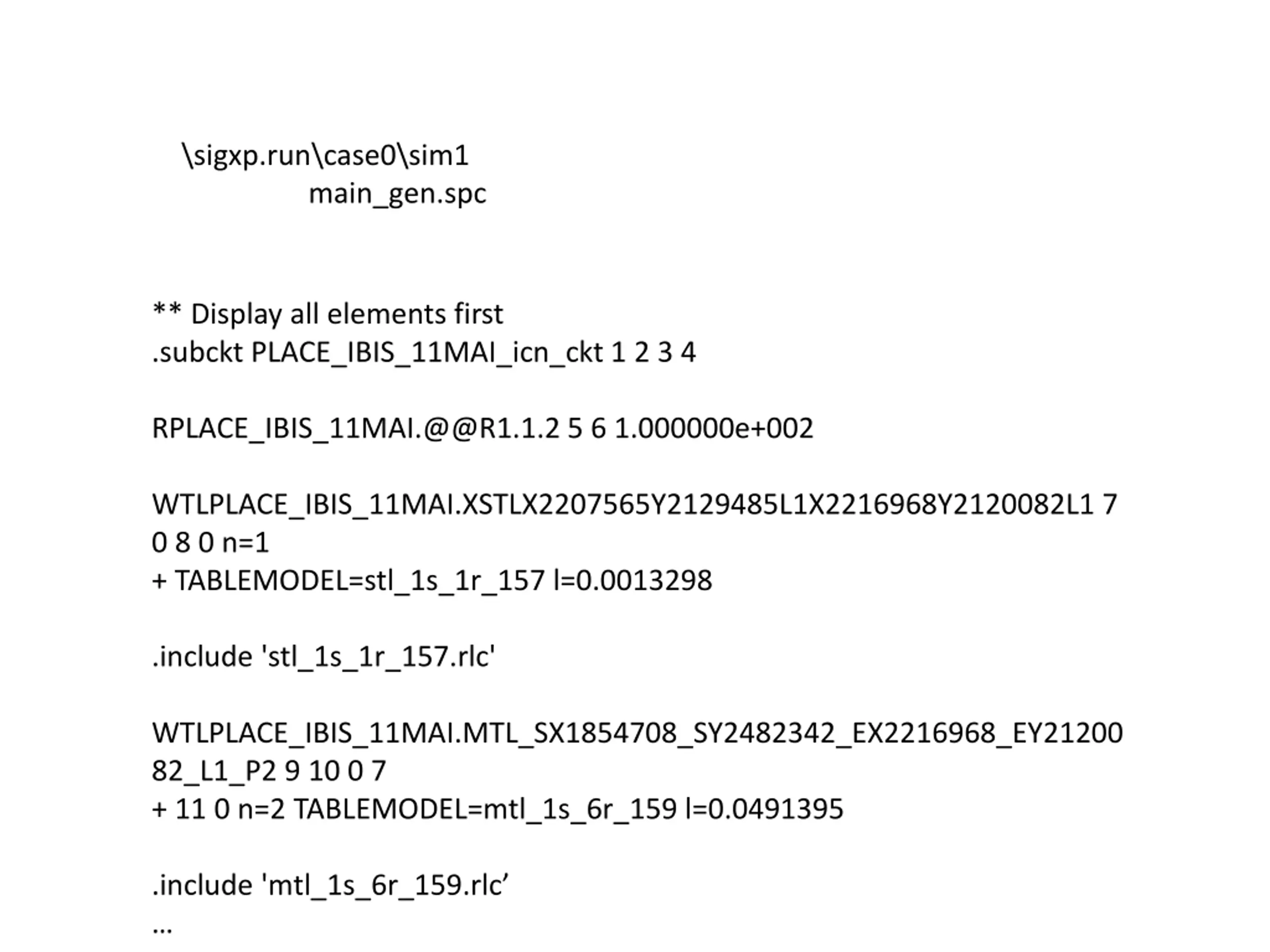 22. \sigxp.run\case0\sim1 main_gen.spc ** Display all elements first .subckt PLACE_IBIS_11MAI_icn_ckt 1 2 3 4 RPLACE_IBIS_11MAI.@@R1.1.2 5 6 1.000000e+002 WTLPLACE_IBIS_11MAI.XSTLX2207565Y2129485L1X2216968Y2120082L1 7 0 8 0 n=1 + TABLEMODEL=stl_1s_1r_157 l=0.0013298 .include 'stl_1s_1r_157.rlc' WTLPLACE_IBIS_11MAI.MTL_SX1854708_SY2482342_EX2216968_EY21200 82_L1_P2 9 10 0 7 + 11 0 n=2 TABLEMODEL=mtl_1s_6r_159 l=0.0491395 .include 'mtl_1s_6r_159.rlc’ …