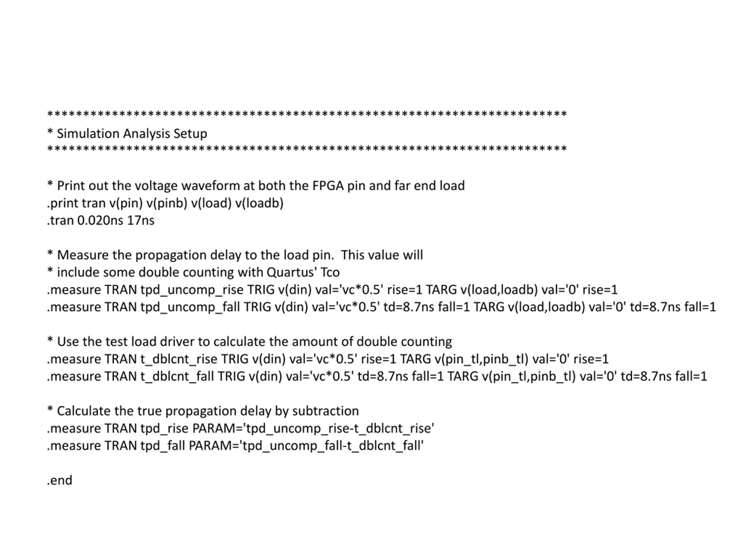 18. ************************************************************************************************************************************************ * Simulation Analysis Setup ************************************************************************ * Print out the voltage waveform at both the FPGA pin and far end load .print tran v(pin) v(pinb) v(load) v(loadb) .tran 0.020ns 17ns * Measure the propagation delay to the load pin. This value will * include some double counting with Quartus' Tco .measure TRAN tpd_uncomp_rise TRIG v(din) val='vc*0.5' rise=1 TARG v(load,loadb) val='0' rise=1 .measure TRAN tpd_uncomp_fall TRIG v(din) val='vc*0.5' td=8.7ns fall=1 TARG v(load,loadb) val='0' td=8.7ns fall=1 * Use the test load driver to calculate the amount of double counting .measure TRAN t_dblcnt_rise TRIG v(din) val='vc*0.5' rise=1 TARG v(pin_tl,pinb_tl) val='0' rise=1 .measure TRAN t_dblcnt_fall TRIG v(din) val='vc*0.5' td=8.7ns fall=1 TARG v(pin_tl,pinb_tl) val='0' td=8.7ns fall=1 * Calculate the true propagation delay by subtraction .measure TRAN tpd_rise PARAM='tpd_uncomp_rise-t_dblcnt_rise' .measure TRAN tpd_fall PARAM='tpd_uncomp_fall-t_dblcnt_fall' .end