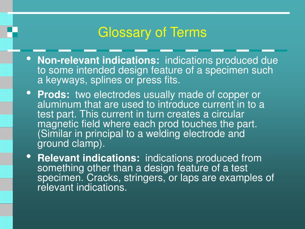 Glossary of Terms • Non-relevant indications: indications produced due to some intended design feature of a specimen such a keyways, splines or press fits. • Prods: two electrodes usually made of copper or aluminum that are used to introduce current in to a test part. This current in turn creates a circular magnetic field where each prod touches the part. (Similar in principal to a welding electrode and ground clamp). • Relevant indications: indications produced from something other than a design feature of a test specimen. Cracks, stringers, or laps are examples of relevant indications.