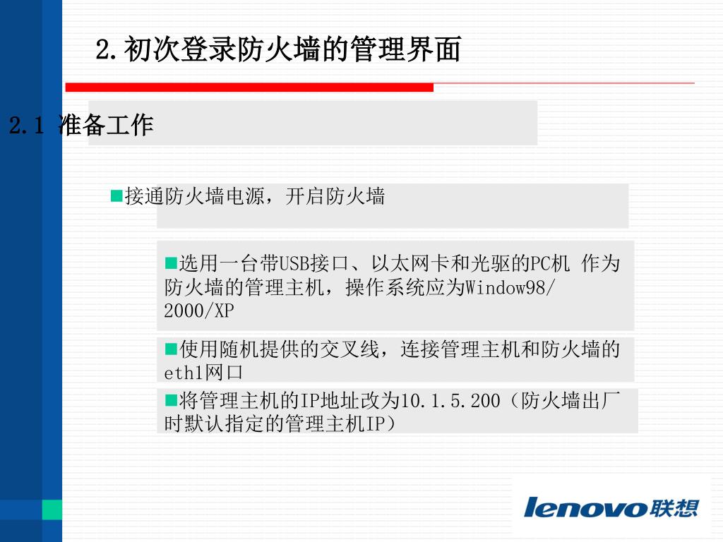 联想信息安全 LSPE 认证培训. 防火墙安装调试教材 ( 适用于防火墙版本V2.1.0 ). 目 录. 1.安装调试前的工作. 2.初次登录防火墙的管理界面. 3.更改防火墙的 IP 地址. 4.串口命令行管理防火墙. 5.典型网络环境防火墙配置. 6.防火墙其它功能的介绍. 7.如遇到问题怎么办. 目 录. 1. 安装调试前的工作. 1.1 拆箱检查. 1.2 要获得专业服务的前期工作. 1.安装调试前的工作. 1.1 拆箱检查. 请安装装箱单的提示进行检查机箱内所有