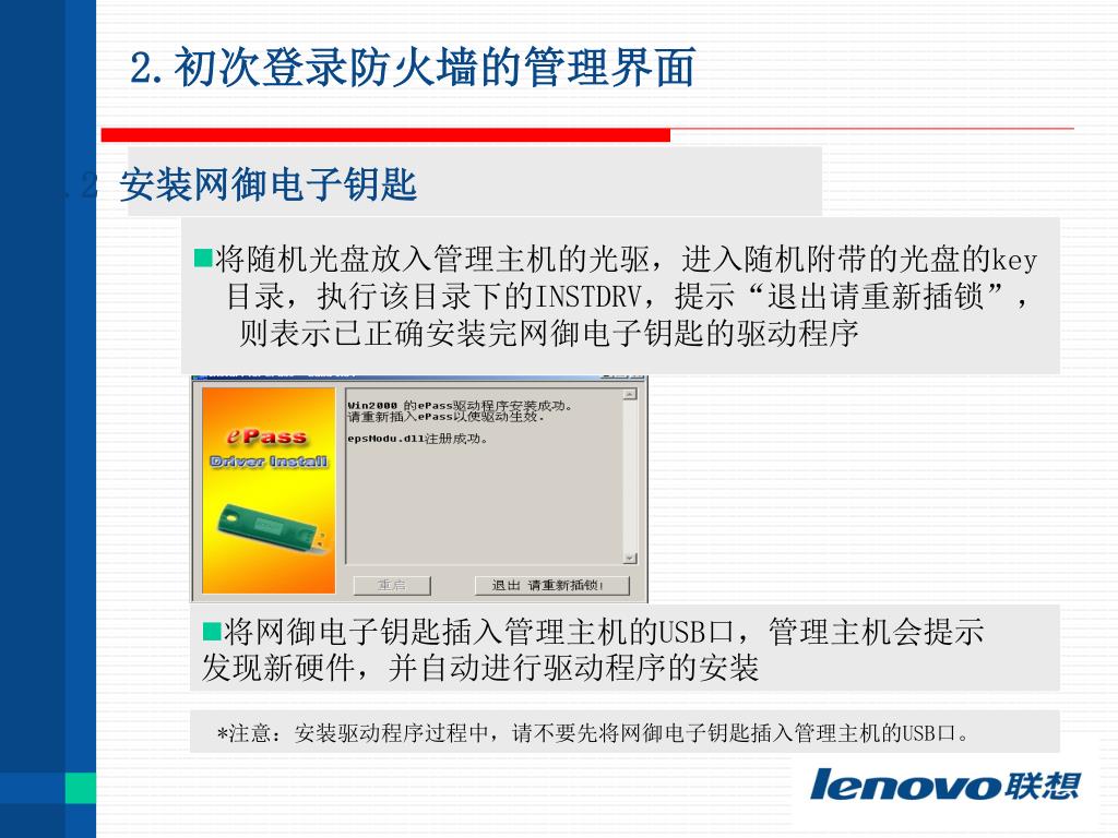2.初次登录防火墙的管理界面 2.2 安装网御电子钥匙 • 将随机光盘放入管理主机的光驱,进入随机附带的光盘的key • 目录,执行该目录下的INSTDRV,提示“退出请重新插锁”, • 则表示已正确安装完网御电子钥匙的驱动程序 • 将网御电子钥匙插入管理主机的USB口,管理主机会提示 • 发现新硬件,并自动进行驱动程序的安装 *注意:安装驱动程序过程中,请不要先将网御电子钥匙插入管理主机的USB口。