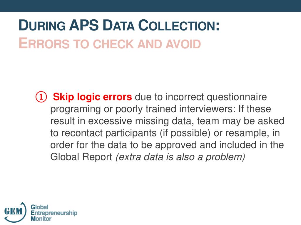 Skip logic errors due to incorrect questionnaire programing or poorly trained interviewers: If these result in excessive missing data, team may be asked to recontact participants (if possible) or resample, in order for the data to be approved and included in the Global Report (extra data is also a problem) During APS Data Collection: Errors to check and avoid