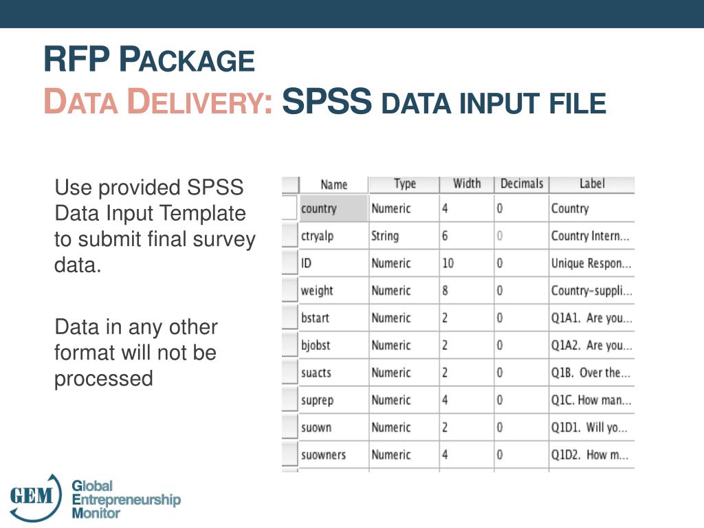 Use provided SPSS Data Input Template to submit final survey data. Data in any other format will not be processed RFP PackageData Delivery: SPSS data input file