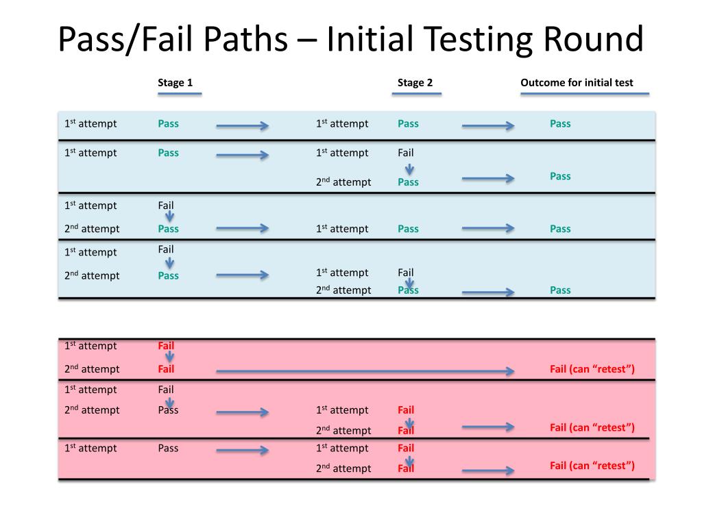Pass/Fail Paths – Initial Testing Round Stage 1 Stage 2 Outcome for initial test 1st attempt Pass 1st attempt Pass Pass 1st attempt Pass 1st attempt Fail Pass 2nd attempt Pass 1st attempt Fail 2nd attempt Pass 1st attempt Pass Pass Fail 1st attempt 1st attempt Fail 2nd attempt Pass 2nd attempt Pass Pass 1st attempt Fail 2nd attempt Fail Fail (can “retest”) 1st attempt Fail 2nd attempt Pass 1st attempt Fail Fail (can “retest”) 2nd attempt Fail 1st attempt Pass 1st attempt Fail Fail (can “retest”) 2nd attempt Fail