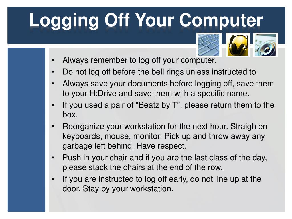 Logging Off Your Computer • Always remember to log off your computer. • Do not log off before the bell rings unless instructed to. • Always save your documents before logging off, save them to your H:Drive and save them with a specific name. • If you used a pair of “Beatz by T”, please return them to the box. • Reorganize your workstation for the next hour. Straighten keyboards, mouse, monitor. Pick up and throw away any garbage left behind. Have respect. • Push in your chair and if you are the last class of the day, please stack the chairs at the end of the row. • If you are instructed to log off early, do not line up at the door. Stay by your workstation.