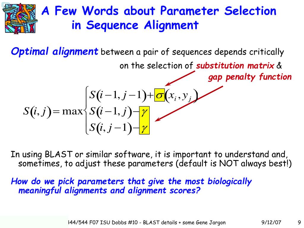 10: Use Smith-Waterman algorithm (DP) to generate alignment • ONLY significant matches are re-analyzed using Smith-Waterman DP algorithm. • Alignments reported by BLAST are produced by dynamic programming BCB 444/544 F07 ISU Dobbs #10 - BLAST details + some Gene Jargon