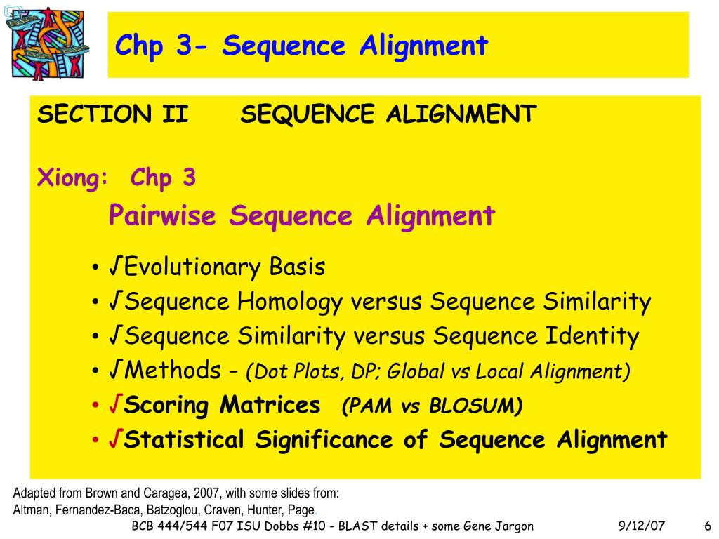 Chp 3- Sequence Alignment SECTION II SEQUENCE ALIGNMENT Xiong: Chp 3 Pairwise Sequence Alignment • √Evolutionary Basis • √Sequence Homology versus Sequence Similarity • √Sequence Similarity versus Sequence Identity • √Methods - (Dot Plots, DP; Global vs Local Alignment) • √Scoring Matrices (PAM vs BLOSUM) • √Statistical Significance of Sequence Alignment Adapted from Brown and Caragea, 2007, with some slides from: Altman, Fernandez-Baca, Batzoglou, Craven, Hunter, Page. BCB 444/544 F07 ISU Dobbs #10 - BLAST details + some Gene Jargon
