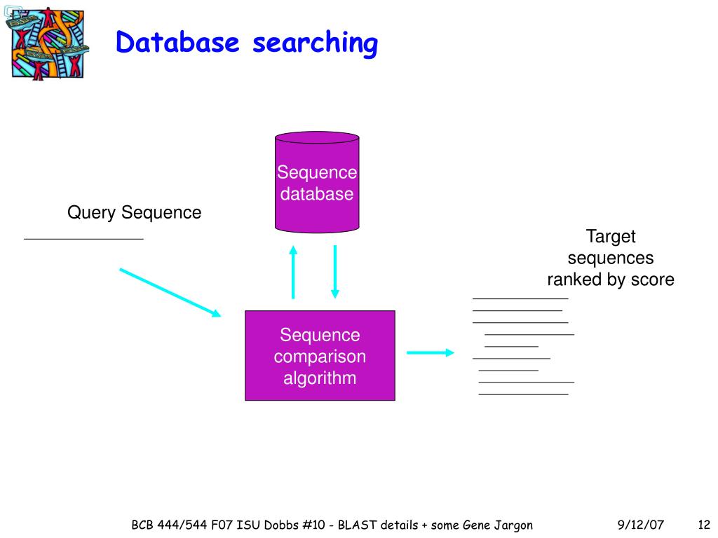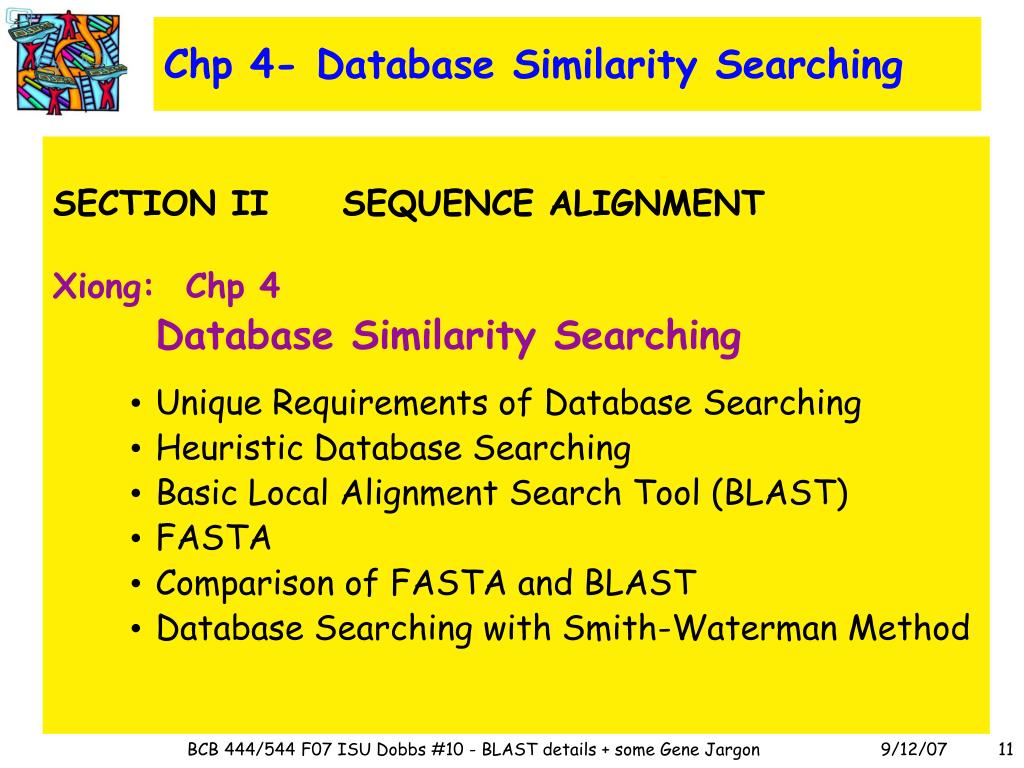 Chp 4- Database Similarity Searching SECTION II SEQUENCE ALIGNMENT Xiong: Chp 4 Database Similarity Searching • Unique Requirements of Database Searching • Heuristic Database Searching • Basic Local Alignment Search Tool (BLAST) • FASTA • Comparison of FASTA and BLAST • Database Searching with Smith-Waterman Method BCB 444/544 F07 ISU Dobbs #10 - BLAST details + some Gene Jargon