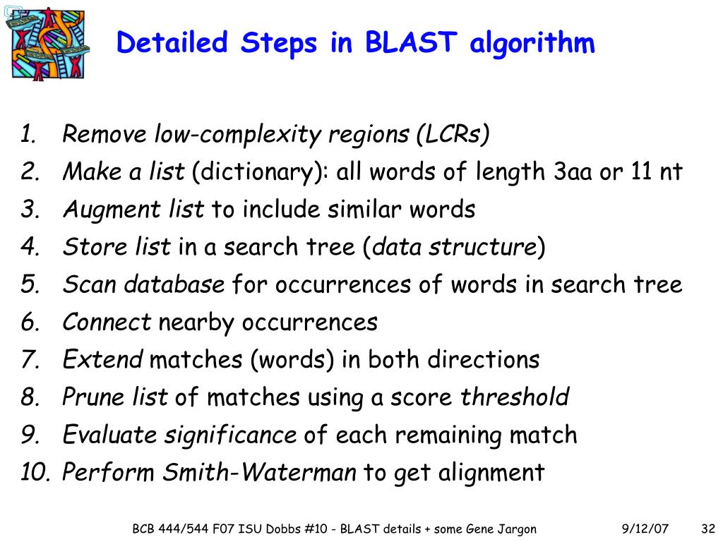 Remove low-complexity regions (LCRs) Make a list (dictionary): all words of length 3aa or 11 nt Augment list to include similar words Store list in a search tree (data structure) Scan database for occurrences of words in search tree Connect nearby occurrences Extend matches (words) in both directions Prune list of matches using a score threshold Evaluate significance of each remaining match Perform Smith-Waterman to get alignment Detailed Steps in BLAST algorithm BCB 444/544 F07 ISU Dobbs #10 - BLAST details + some Gene Jargon