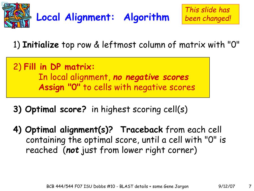 Local Alignment: Algorithm This slide has been changed! 1) Initialize top row & leftmost column of matrix with "0" 2) Fill in DP matrix: In local alignment, no negative scores Assign "0" to cells with negative scores 3) Optimal score? in highest scoring cell(s) 4) Optimal alignment(s)? Traceback from each cell containing the optimal score, until a cell with "0" is reached (not just from lower right corner) BCB 444/544 F07 ISU Dobbs #10 - BLAST details + some Gene Jargon