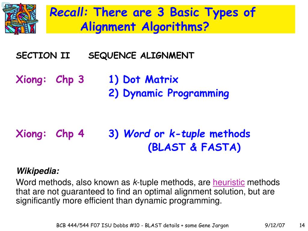 Recall: There are 3 Basic Types of Alignment Algorithms? SECTION II SEQUENCE ALIGNMENT Xiong: Chp 3 1) Dot Matrix 2) Dynamic Programming Xiong: Chp 4 3) Word or k-tuple methods (BLAST & FASTA) Wikipedia: Word methods, also known as k-tuple methods, are heuristic methods that are not guaranteed to find an optimal alignment solution, but are significantly more efficient than dynamic programming. BCB 444/544 F07 ISU Dobbs #10 - BLAST details + some Gene Jargon