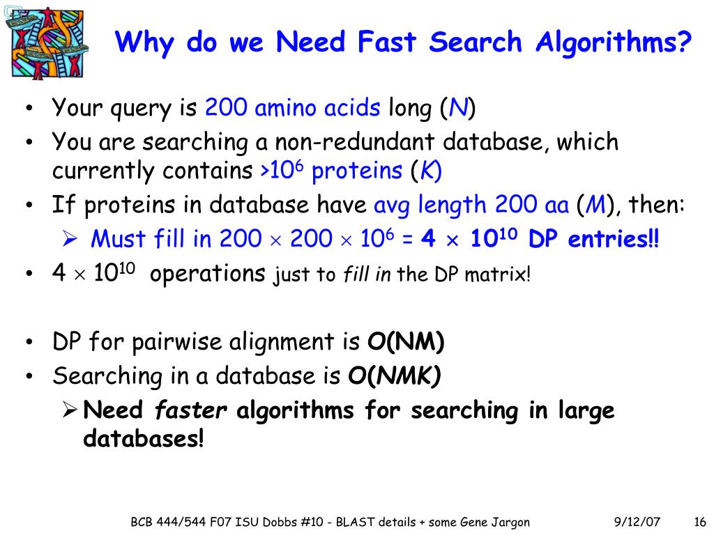 Why do we Need Fast Search Algorithms? • Your query is 200 amino acids long (N) • You are searching a non-redundant database, which currently contains >106 proteins (K) • If proteins in database have avg length 200 aa (M), then: • Must fill in 200 200 106 = 4 1010 DP entries!! • 4 1010 operations just to fill in the DP matrix! • DP for pairwise alignment is O(NM) • Searching in a database is O(NMK) • Need faster algorithms for searching in large databases! BCB 444/544 F07 ISU Dobbs #10 - BLAST details + some Gene Jargon