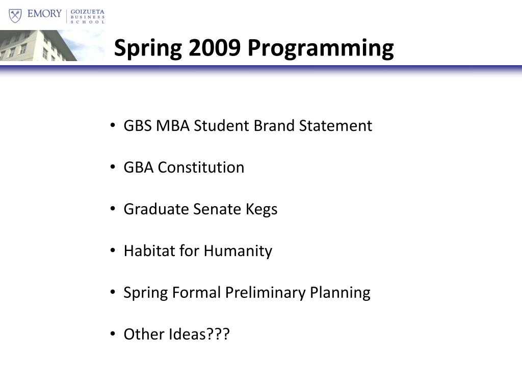 Spring 2009 Programming • GBS MBA Student Brand Statement • GBA Constitution • Graduate Senate Kegs • Habitat for Humanity • Spring Formal Preliminary Planning • Other Ideas???