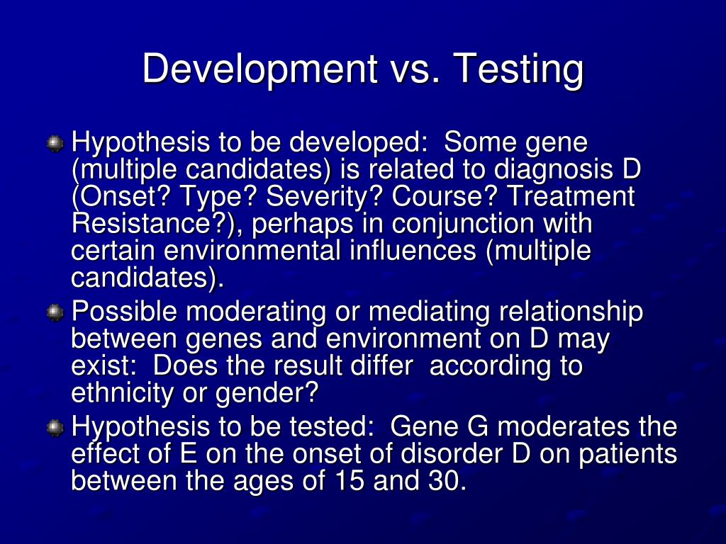 Development vs. Testing • Hypothesis to be developed: Some gene (multiple candidates) is related to diagnosis D (Onset? Type? Severity? Course? Treatment Resistance?), perhaps in conjunction with certain environmental influences (multiple candidates). • Possible moderating or mediating relationship between genes and environment on D may exist: Does the result differ according to ethnicity or gender? • Hypothesis to be tested: Gene G moderates the effect of E on the onset of disorder D on patients between the ages of 15 and 30.