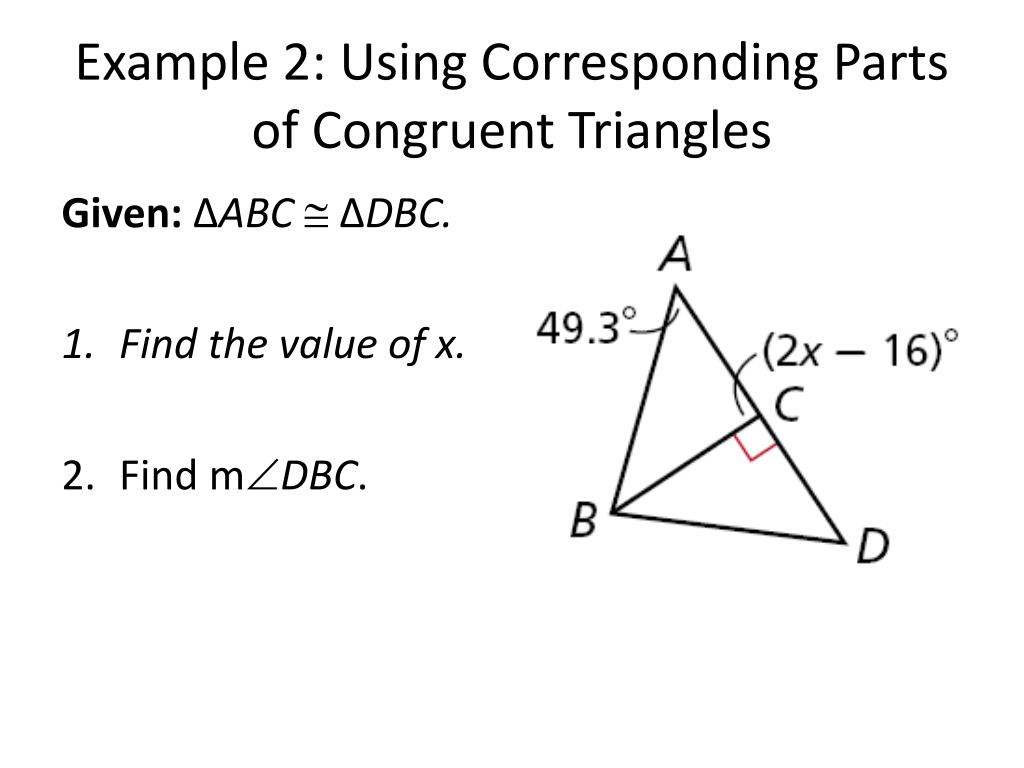 Example 2: Using Corresponding Parts of Congruent Triangles Given: ∆ABC ∆DBC. • Find the value of x. • Find mDBC.