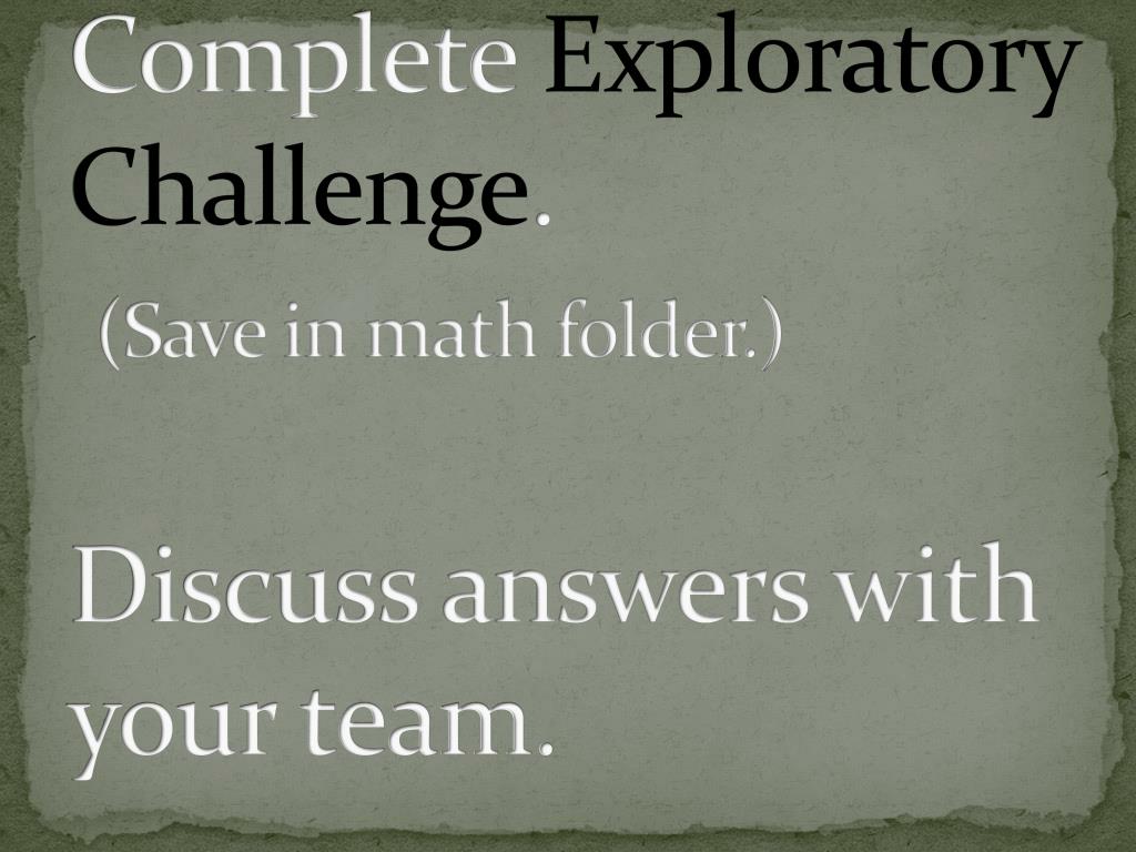 Complete Exploratory Challenge.(Save in math folder.)Discuss answers with your team.