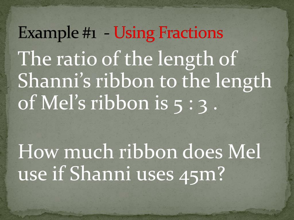 Example #1 - Using Fractions The ratio of the length of Shanni’s ribbon to the length of Mel’s ribbon is 5 : 3 . How much ribbon does Mel use if Shanni uses 45m?