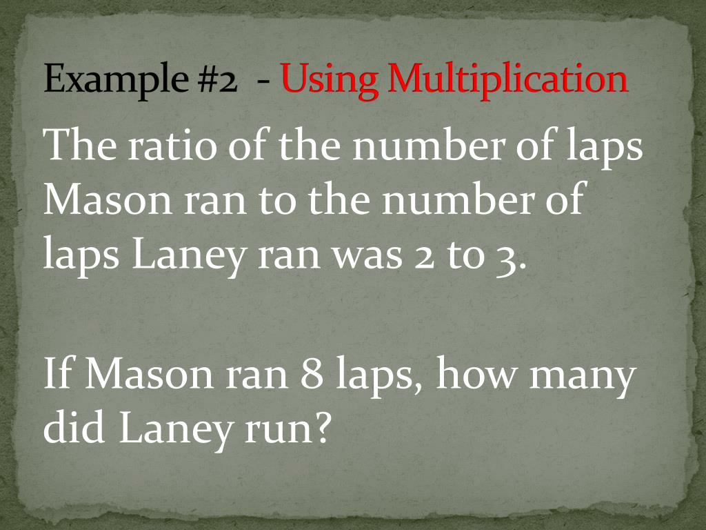 Example #2 - Using Multiplication The ratio of the number of laps Mason ran to the number of laps Laney ran was 2 to 3. If Mason ran 8 laps, how many did Laney run?