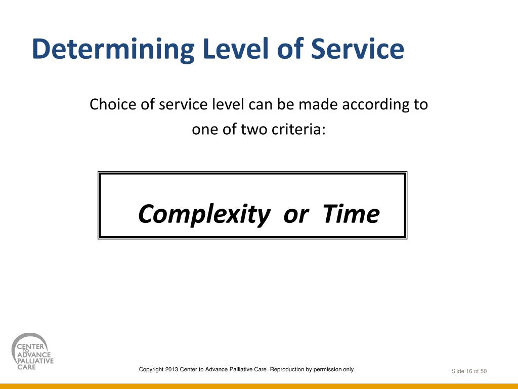 Determining Level of Service Choice of service level can be made according to one of two criteria: Complexity or Time