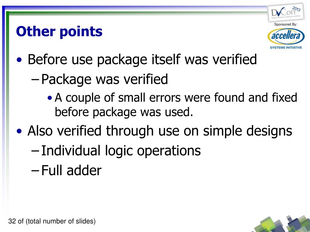 Other points • Before use package itself was verified • Package was verified • A couple of small errors were found and fixed before package was used. • Also verified through use on simple designs • Individual logic operations • Full adder