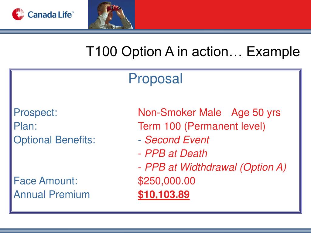 T100 Option A in action… Example Proposal Prospect:Non-Smoker Male Age 50 yrs Plan: Term 100 (Permanent level) Optional Benefits: - Second Event - PPB at Death - PPB at Widthdrawal (Option A) Face Amount: $250,000.00 Annual Premium $10,103.89