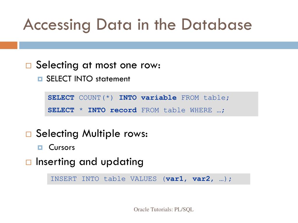Accessing Data in the Database • Selecting at most one row: • SELECT INTO statement • Selecting Multiple rows: • Cursors • Inserting and updating SELECT COUNT(*) INTO variable FROM table; SELECT * INTO record FROM table WHERE …; INSERT INTO table VALUES (var1, var2, …); Oracle Tutorials: PL/SQL