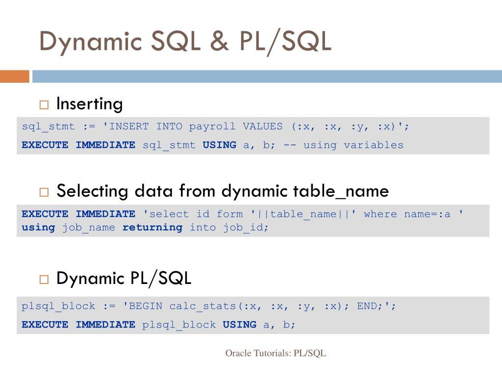 Dynamic SQL & PL/SQL • Inserting • Selecting data from dynamic table_name • Dynamic PL/SQL sql_stmt := 'INSERT INTO payroll VALUES (:x, :x, :y, :x)'; EXECUTE IMMEDIATE sql_stmtUSING a, b;-- usingvariables EXECUTE IMMEDIATE'select id form '||table_name||' wherename=:a' usingjob_namereturningintojob_id; plsql_block := 'BEGIN calc_stats(:x, :x, :y, :x); END;'; EXECUTE IMMEDIATEplsql_blockUSING a, b; Oracle Tutorials: PL/SQL