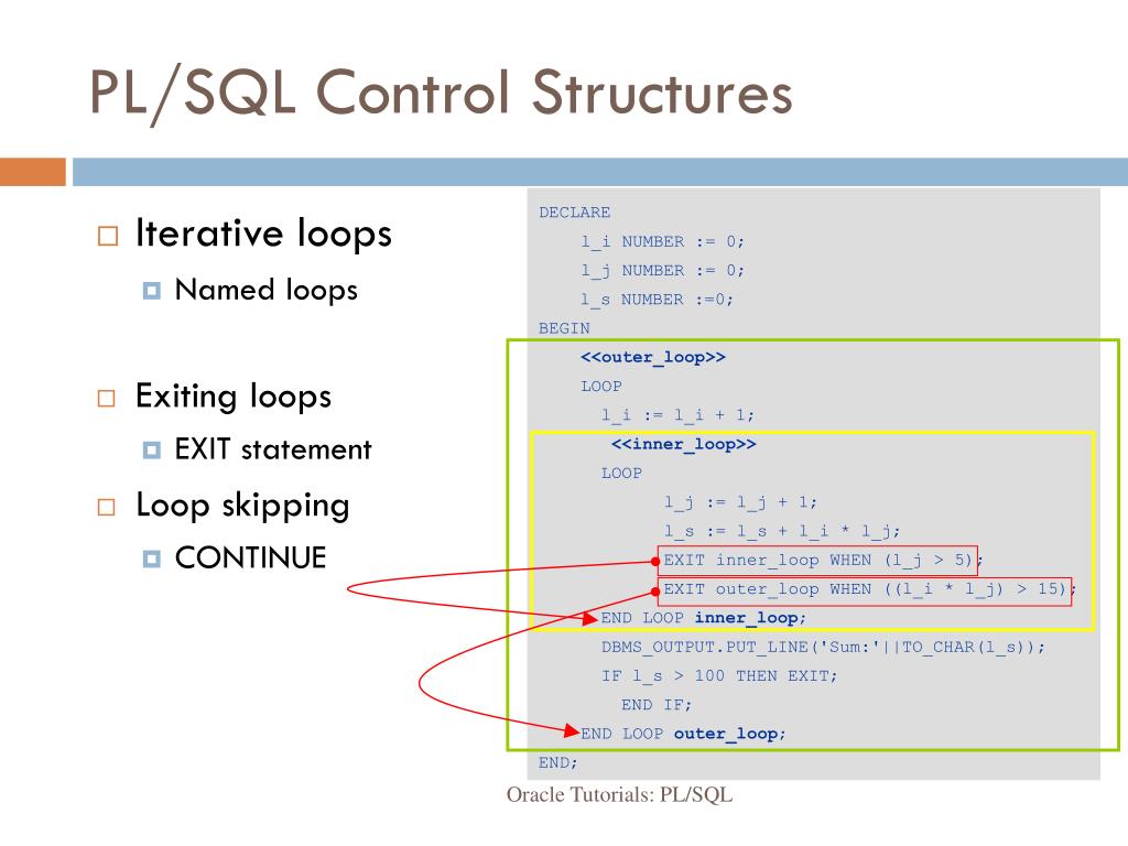 PL/SQL Control Structures DECLARE l_iNUMBER := 0; l_j NUMBER := 0; l_s NUMBER :=0; BEGIN <<outer_loop>> LOOP l_i:= l_i+ 1; <<inner_loop>> LOOP l_j := l_j + 1; l_s := l_s + l_i* l_j; EXIT inner_loop WHEN (l_j > 5); EXIT outer_loop WHEN ((l_i* l_j) > 15); END LOOP inner_loop; DBMS_OUTPUT.PUT_LINE('Sum:'||TO_CHAR(l_s)); IF l_s > 100 THEN EXIT; END IF; END LOOP outer_loop; END; • Iterative loops • Named loops • Exiting loops • EXIT statement • Loop skipping • CONTINUE Oracle Tutorials: PL/SQL