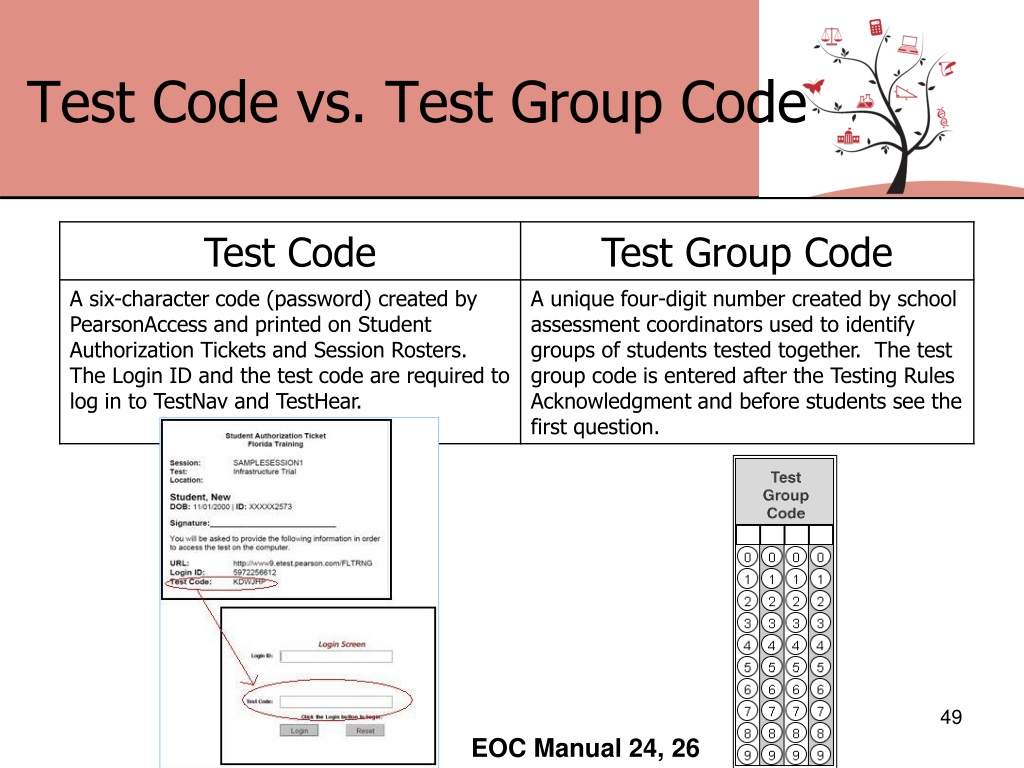 Test Code vs. Test Group Code EOC Manual 24, 26