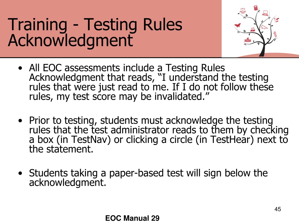 Training - Testing Rules Acknowledgment All EOC assessments include a Testing Rules Acknowledgment that reads, “I understand the testing rules that were just read to me. If I do not follow these rules, my test score may be invalidated.” Prior to testing, students must acknowledge the testing rules that the test administrator reads to them by checking a box (in TestNav) or clicking a circle (in TestHear) next to the statement. Students taking a paper-based test will sign below the acknowledgment. EOC Manual 29