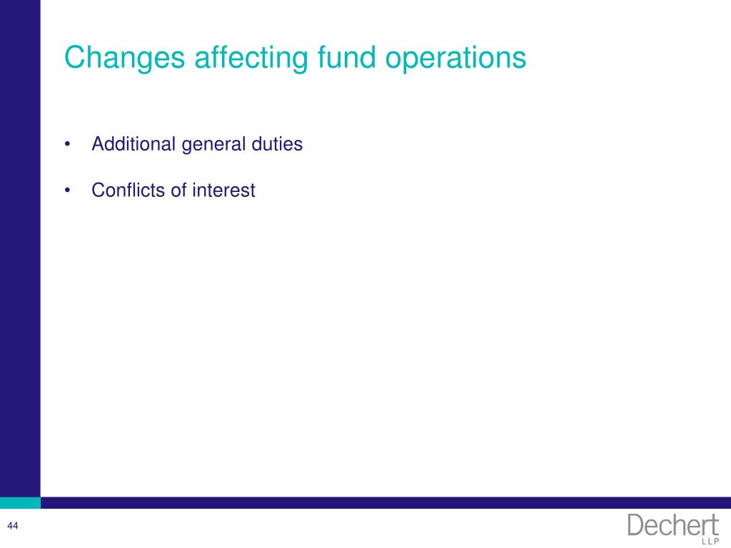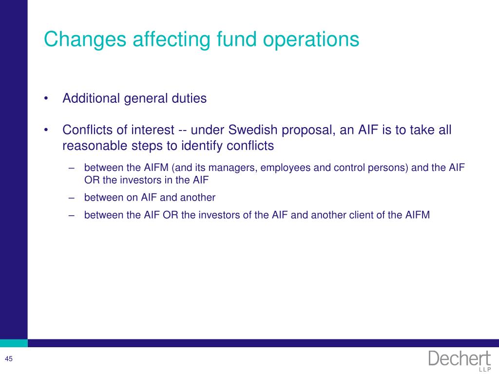 Changes affecting fund operations • Additional general duties • Conflicts of interest -- under Swedish proposal, an AIF is to take all reasonable steps to identify conflicts • between the AIFM (and its managers, employees and control persons) and the AIF OR the investors in the AIF • between on AIF and another • between the AIF OR the investors of the AIF and another client of the AIFM
