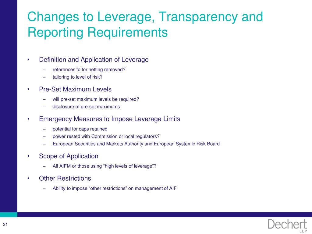 Changes to Leverage, Transparency and Reporting Requirements • Definition and Application of Leverage • references to for netting removed? • tailoring to level of risk? • Pre-Set Maximum Levels • will pre-set maximum levels be required? • disclosure of pre-set maximums • Emergency Measures to Impose Leverage Limits • potential for caps retained • power rested with Commission or local regulators? • European Securities and Markets Authority and European Systemic Risk Board • Scope of Application • All AIFM or those using “high levels of leverage”? • Other Restrictions • Ability to impose “other restrictions” on management of AIF