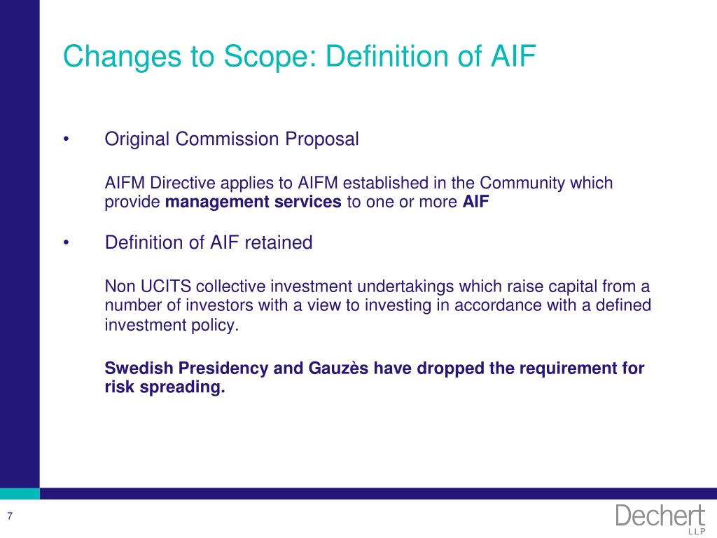 Changes to Scope: Definition of AIF • Original Commission Proposal AIFM Directive applies to AIFM established in the Community which provide management services to one or more AIF • Definition of AIF retained Non UCITS collective investment undertakings which raise capital from a number of investors with a view to investing in accordance with a defined investment policy. Swedish Presidency and Gauzès have dropped the requirement for risk spreading.