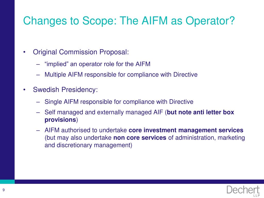 Changes to Scope: The AIFM as Operator? • Original Commission Proposal: • “implied” an operator role for the AIFM • Multiple AIFM responsible for compliance with Directive • Swedish Presidency: • Single AIFM responsible for compliance with Directive • Self managed and externally managed AIF (but note anti letter box provisions) • AIFM authorised to undertake core investment management services (but may also undertake non core services of administration, marketing and discretionary management)